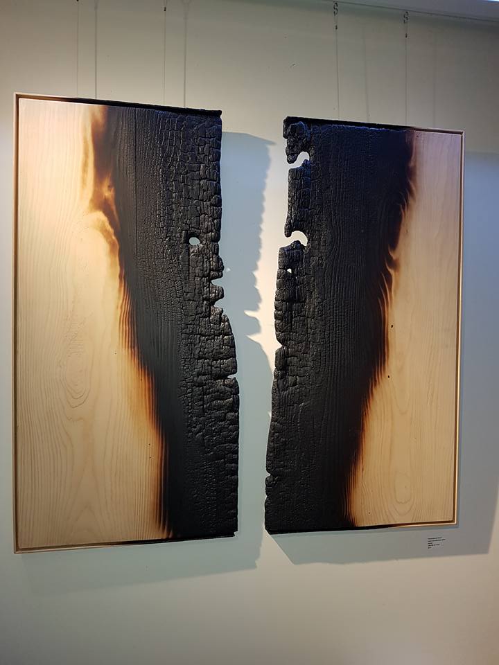 In Paesaggi Umani troviamo opere con cornici liquefatte, cemento frammentato, grovigli di corde ben intrecciate, bruciature quasi perfette. Il colore qui non è un elemento cromatico, meramente estetico, ma un principio significativo. Le sfumature sono lievissime, prevalgono il conflitto e l’uniformità, ulteriore simbolo di dualità psicologica e sensoriale.